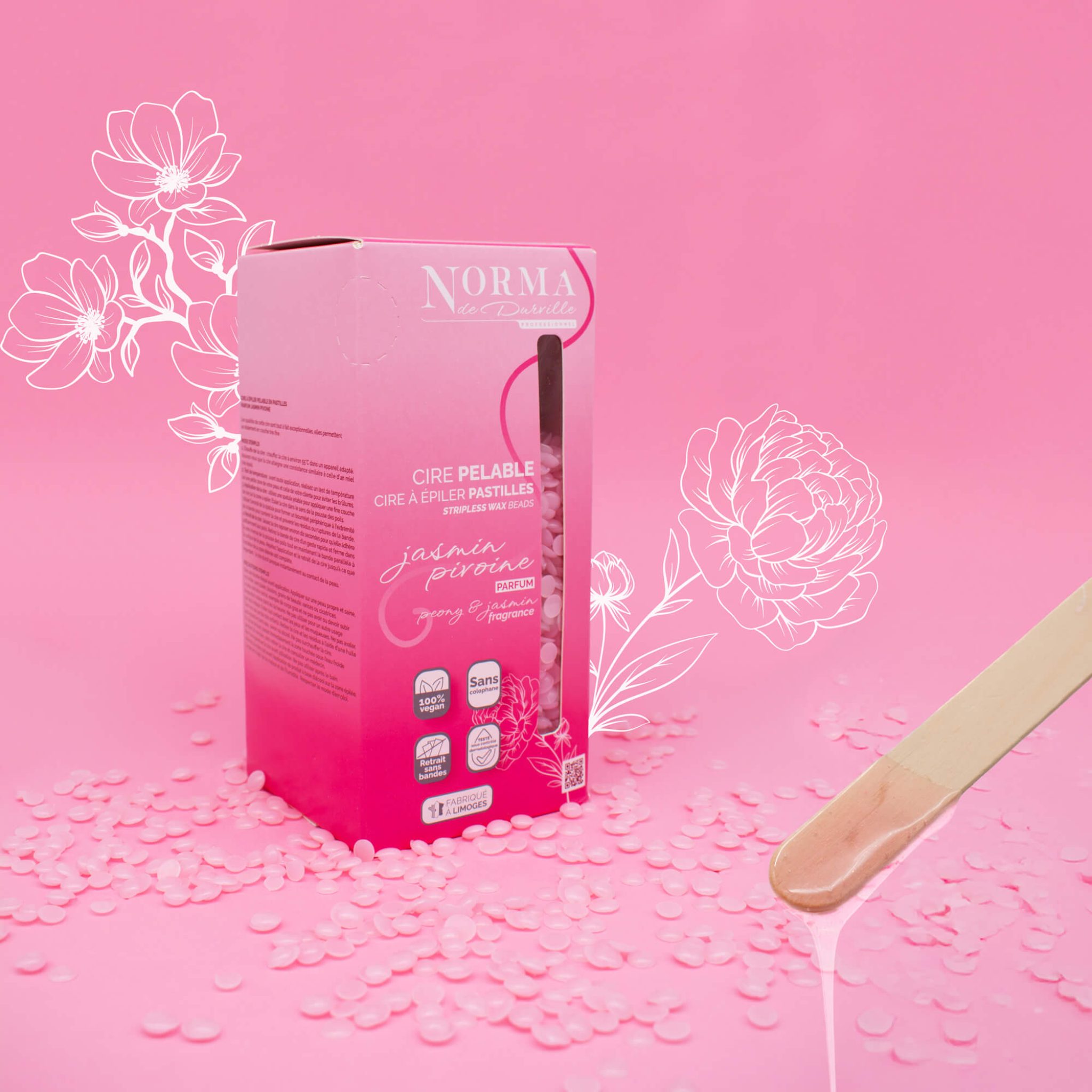 Cire pelable sans colophane, testée sous contrôle dermatologique. Rose avec des paillettes. Parfum printanier Jasmin Pivoine.